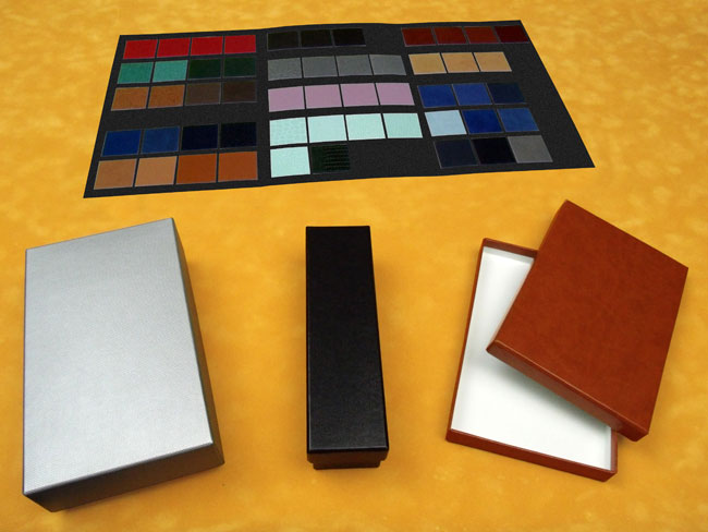 Le détail de la page “choix du carton” vous aidera à déterminer l’épaisseur et la qualité du carton ainsi que sa finition. Lorsque ces 2 critères ont été défini, dans la page “habillage” vous avez la possibilité de choisir la couleur du papier de recouvrement (extérieur et/ou intérieur) ainsi que sa texture (lisse, gaufré...). Nous travaillons aussi avec des revêtements spéciaux de type toile, simili cuir, suedine...