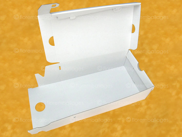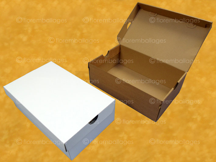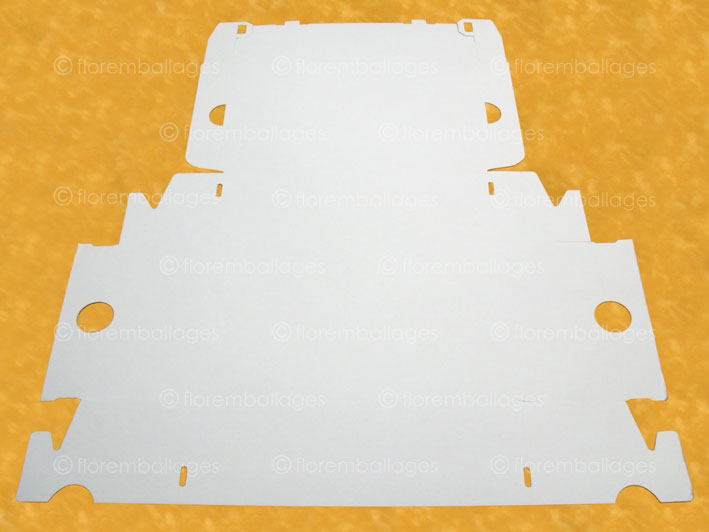 1,5 mm, la finition de surface est ou blanc mat, ou brun mat. Cette boîte carton est conditionnée à plat et après mise en forme, a un couvercle abattant. Le couvercle solidaire du socle est articulé, le montage à partir de la pièce à plat nécessite un enchaînement de pliages, cette boîte carton a une bonne rigidité après montage. Il est nécessaire de bloquer des languettes et/ou encoches découpées dans le carton pour pouvoir assurer que la boîte reste en forme après pliage. Cette boîte carton de conception "à plat" est très utilisée pour les boxs mensuelle, emballer chaussures de sport, emballer des chaussons, des bottines... Cette boîte peut également servir comme boîte d'expédition, la fabrication de ce modèle de boîte se fait sur-mesure.