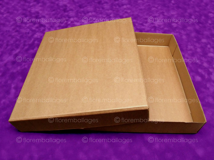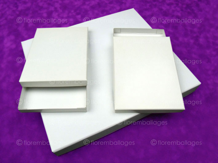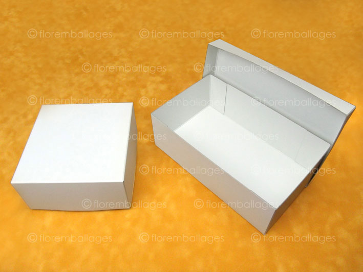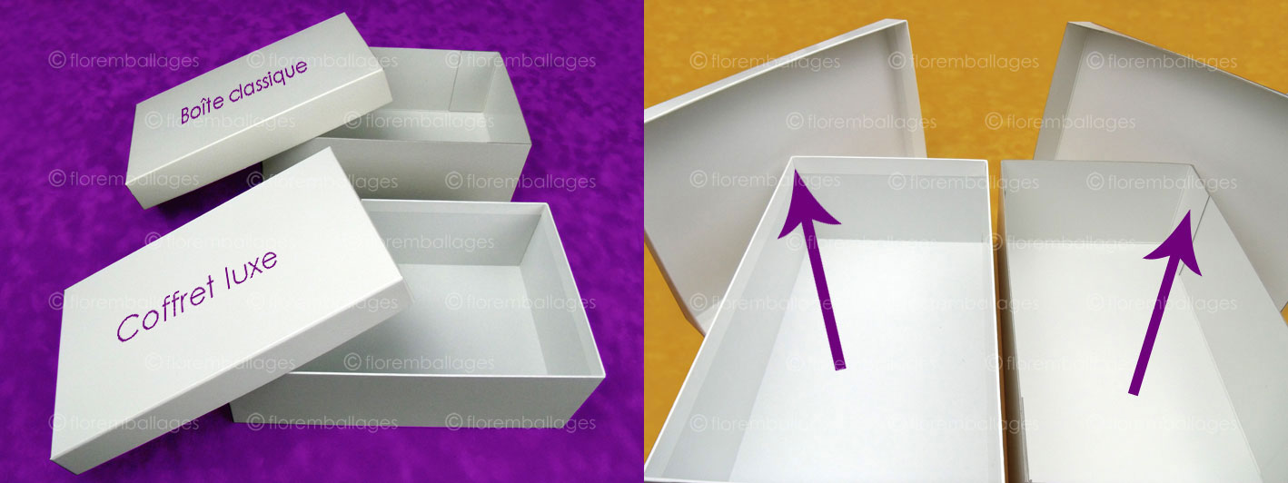 Boîte / emballage classique en carton RIGIDE (carton épais - finition brute) et déjà en volume (boîte montée) dont le fond et le couvercle sont en 2 parties (fond et couvercle dissociables composés d’un socle et d’un couvercle coiffant). La variante de ce boîtage / emballage classique comparé au coffret de finition luxe est qu'il n'est pas habillé de papier. Sa conception est à “tenons collés”, cette expression signifie que les tenons des angles sont redoublés et collés (voir photos ci-dessous). Il est produit en carton RIGIDE brut d'épaisseur minimum 1 mm (blanc, gris, rouge, vert...) et d'épaisseur maximum de 2,5 mm. Ce type de grammage de carton convient particulièrement pour fabriquer des boîtes de grandes dimensions et qui nécessite une bonne tenue. En cliquant ici vous pouvez retrouver le même coffret mais avec une finition luxe (coffret recouvert et habillé).