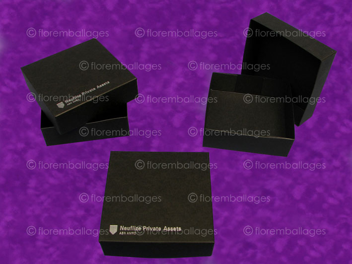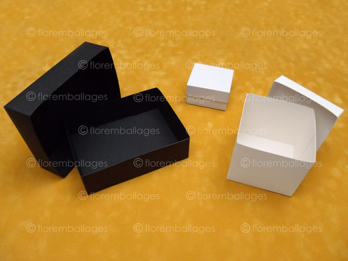 Boîte classique en carton BRUT SOUPLE (carton de faible épaisseur avec finition BRUTE) dont le fond et le couvercle sont en 2 parties (fond et couvercle dissociables qui comprennent un socle et un couvercle qui s’emboîtent ensemble). Ce type de boîtage avec patelettes collées / boîte avec patelettes collées est un emballage qui est monté, c’est-à-dire en volume. La variante de cette boîte classique en carton BRUT FIN comparé au coffret classique en carton RIGIDE HABILLE est qu'il est produit en carton souple brut d'épaisseur minimum 0,35 mm (blanc, noir, marron, rouge, vert...) et d'épaisseur maximum de 0,50 mm. Ce type de grammage de carton convient particulièrement pour fabriquer des boîtes de petites dimensions. La forme des coffrets peuvent être de forme rectangulaire ou carrée. En cliquant ici vous pouvez retrouver le même coffret mais avec une finition luxe (coffret recouvert et habillé).