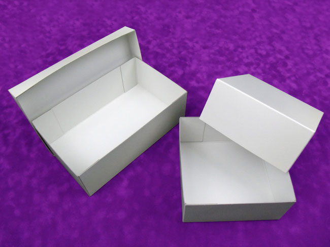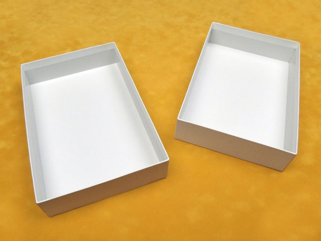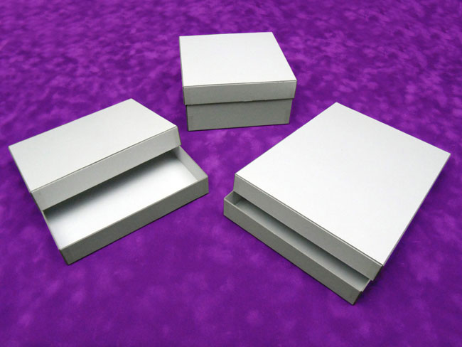 Pour une finition brute ou naturelle, à partir de feuilles de carton blanches, grises, noires et bien d’autres, nous fabriquons les boîtes rainées à tenons collés. Les formats sont adaptés sur-mesure et quasiment toutes les dimensions sont réalisables dans la limite de notre parc machine. Le grammage du carton est défini selon la grandeur de la boîte et selon la tenue finale qu’elle doit avoir. Les feuilles de carton que nous utilisons sont contrecollées d’un papier ou teintées dans la masse. Pour rester dans une finition authentique, la boîte peut être recouverte et contrecollée intérieurement, recouverte et rembordée extérieurement ou voire même les deux de papier couleur kraft (kraft vergé ou non vergé).