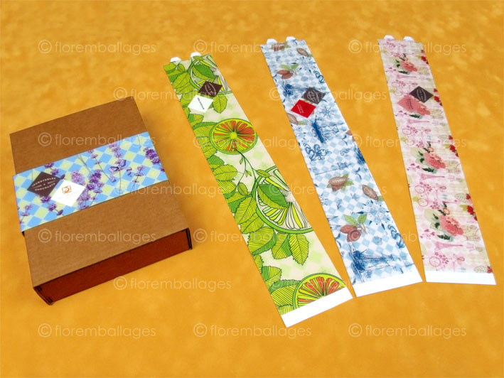 Une glissière en carton est fabriquée en une seule partie. Nous avons recours a un collage d'une patte pour qu'il soit prêt à l'emploi, cependant nous pouvons le produire totalement à plat, ce bandeau carton est alors muni de languettes découpées dans le carton, la mise en forme est simple et rapide également avec cette conception. Cette glissière / entourage / bandeau cartonné peut être fabriqué en carton blanc sans impression, en carton kraft sans impression ou avec un carton teint dans la masse. Après dépliage il se glisse sur un produit ou sur un emballages, c'est une bonne alternative quand le carton pour lequel la glissière à été fabriquée est sans impression. Ca permet d'ajouter toute sortes d'informations, il y a 4 faces exploitables en impression (la face du dessus, les 2 parties verticales et la face du dessous). Cet entourage en carton est fabriqué en carton souple, la personnalisation est possible en impression numérique, en impression offset avec vernis acrylique ou vernis UV, nous pouvons encore l'imprimer en sérigraphie ou en marquage à chaud. L'impression et la personnalisation des ces glissières carton - entourages carton est réalisable soit partiellement (phrase, logo, image) ou en en totalité (motif total, fond de couleur) que ce soit sur une ou plusieurs faces (voir page impression / personnalisation étuis pliants). Une ouverture (fenêtre SANS FILM PLASTIQUE DE PROTECTION) dans la glissière est réalisable, l'emplacement, la forme et le format sont à définir et sont sur-mesure.