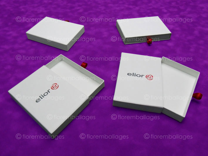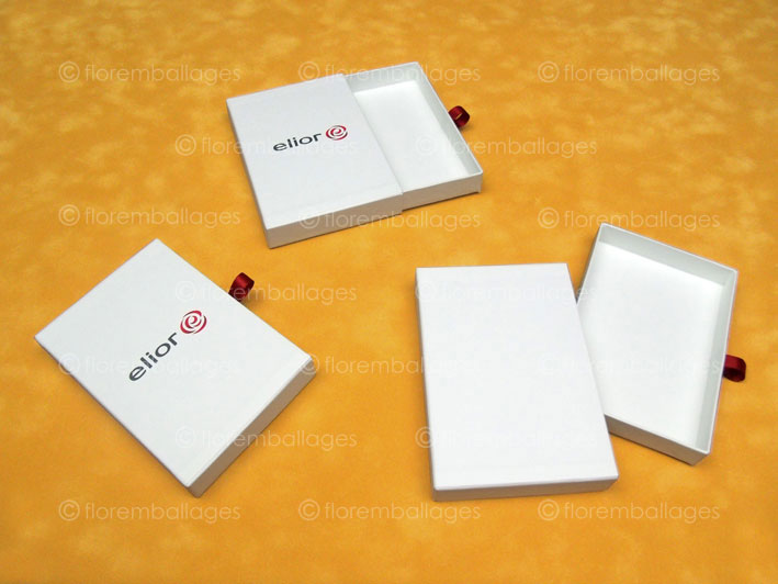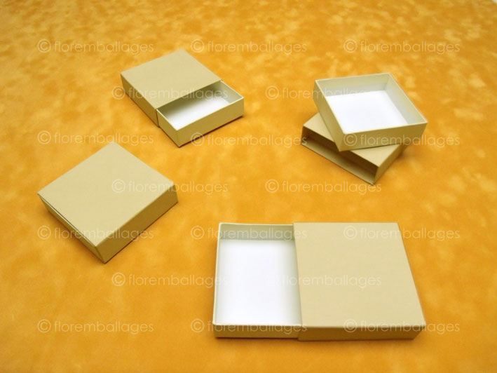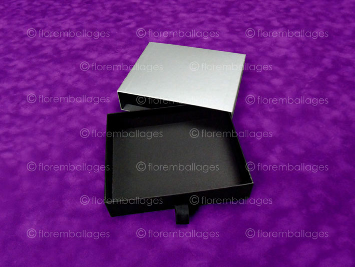 Un coffret à glissière (ou boîte à glissière) est une boîte composée de deux éléments. Une glissière ouverte des deux côtés et une cuvette (fond de boîte) qui coulisse à l'intérieur de la glissière. Sur ce modèle il est possible de faire glisser la cuvette (ouverture et fermeture) par les 2 côtés opposés. Une variante peut être proposée, elle consiste à ce que la glissière n'ait qu'un seul côté ouvert et que la cuvette qui coulisse à l'intérieur devienne un tiroir. Cette variante s'appelle coffret avec tiroir ou boîte à tiroir. Ces coffrets / boîtes à glissière et coffrets / boîtes avec tiroir sont des coffrets qui sont en volume, c’est-à-dire déjà en forme / monté. Ces coffrets ont la conception adéquat pour être habillés / revêtus extérieurement et/ou intérieurement d’un papier neutre ou imprimé. Mais ils peuvent également être habillés d’un revêtement spécial neutre ou imprimé. Nous disposons d’une multitude de choix de papier et de revêtements spéciaux en terme de coloris et de texture.
