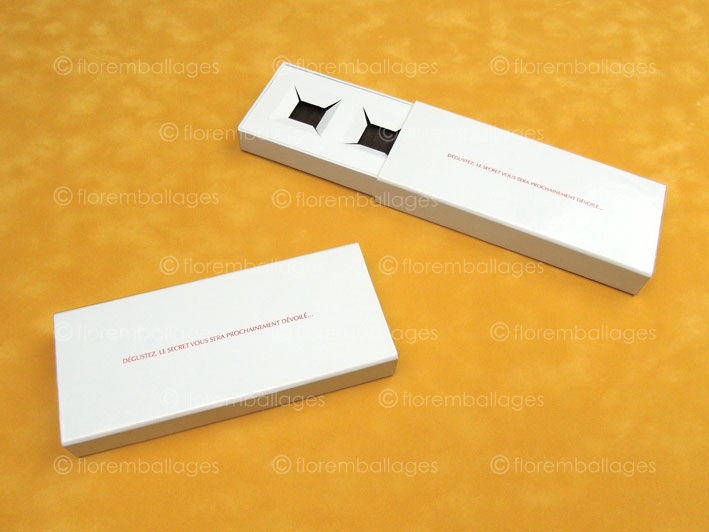 Pour détailler clairement chaque type de coffrets, le contenu principal ci-après démontre globalement un style de boîte. La conception de ce style de packaging est décrite et mis en scène avec des clichés pris sous différents angles. Les appellations peuvent devenir différentes d’un fabricant à l’autre, c’est pour cela que “autres appellations possibles” répertorie les autres termes techniques qui sont des noms moins utilisés, mais tout de même existant pour parler de ces coffrets avec glissière / boîtes avec glissière. La page finition coffrets sert à répertorier toutes les personnalisations possibles et réalisables (papier, impression...). Ci-dessous, quelques exemples de coffrets avec glissière / boite avec glissière en carton pour lesquels nous proposons des fabrications sur-mesure.