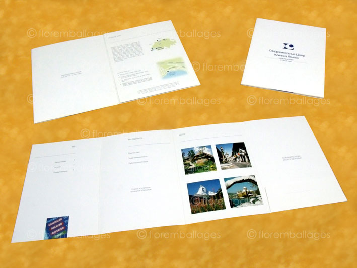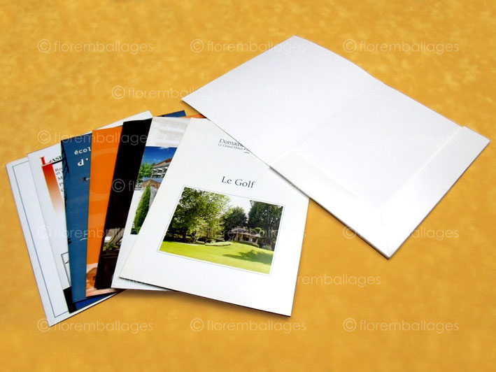 Autres appellations possibles : pochette carton à plusieurs rabats, pochette à rabat avec encoches pour carte de visite, pochette à rabat avec pochette pour CD, pochette à rabat pour documents A4, A5, A6, chemise à rabat, chemise de classement, pochette de classement, plaquette de présentation